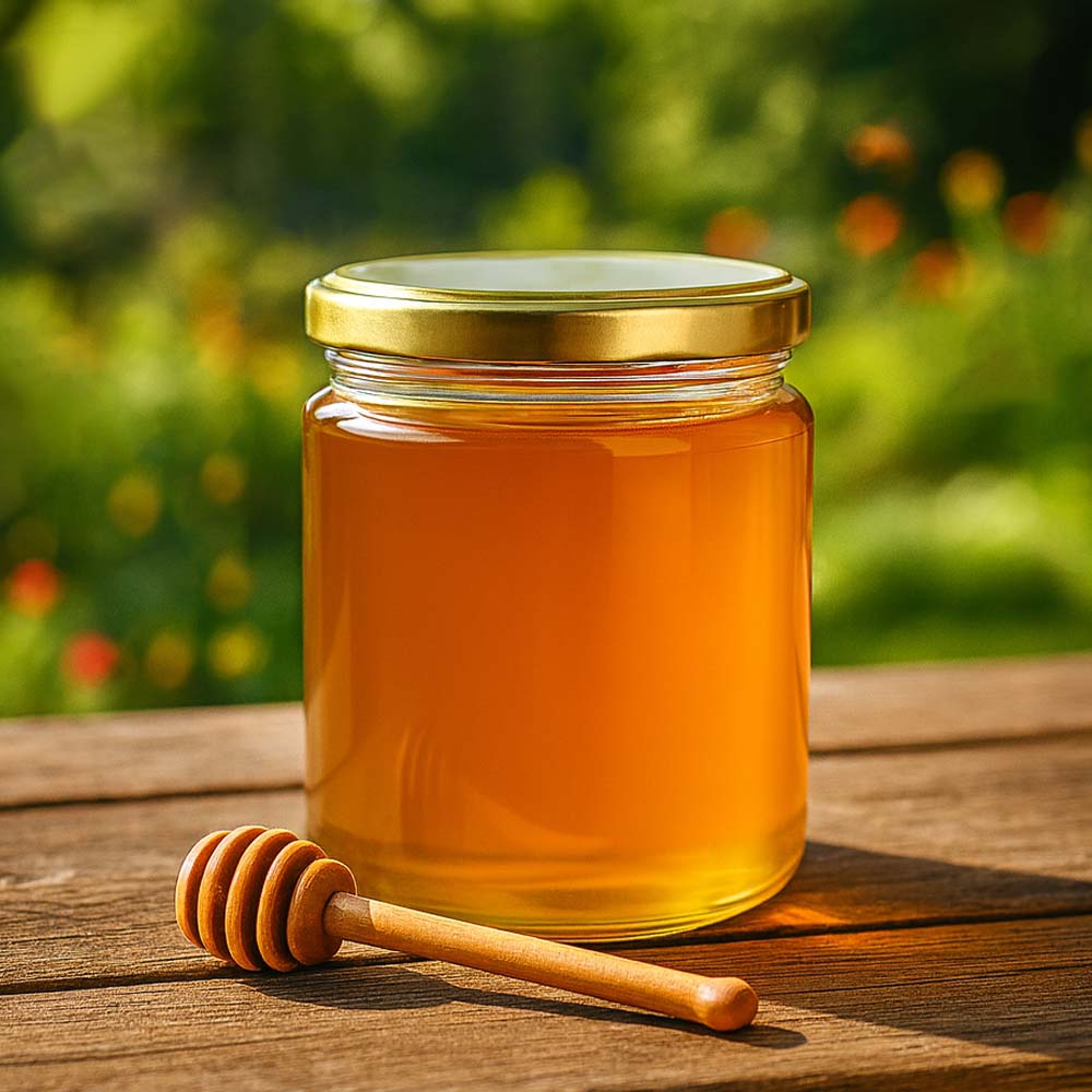 Tarro de vidrio para miel de 350 g con tapa metálica dorada BasicSeal UNiTWIST. Ideal para ventas premium, presentaciones atractivas y packs regalo.