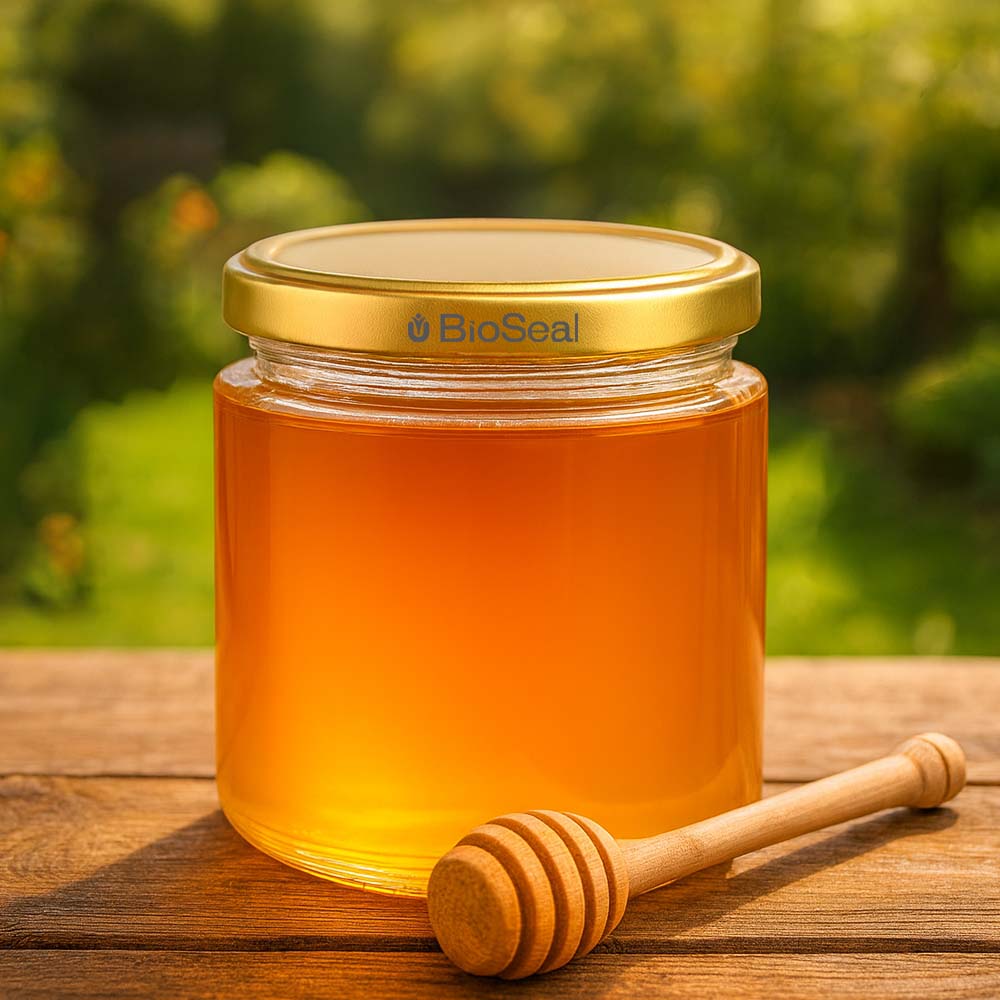 Tarro de vidrio para miel de 350 g con tapa metálica dorada BioSeal UNiTWIST. Ideal para ventas premium, presentaciones y packs regalo.