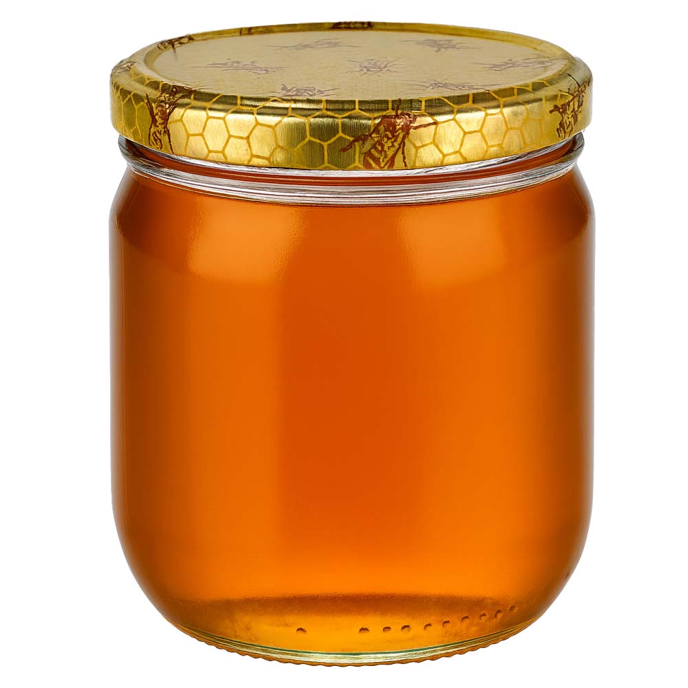 Tarro de vidrio para miel de 500 g con tapa metálica con diseño de panal BasicSeal UNiTWIST. Su aspecto decorativo resalta la naturalidad del producto y es ideal para regalos, ventas directas y presentaciones de calidad.