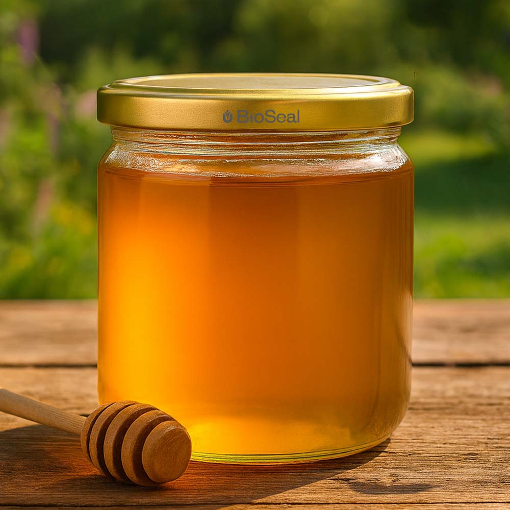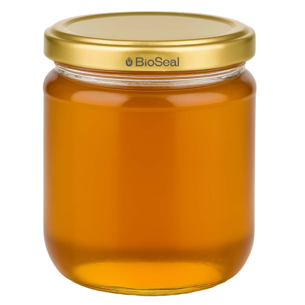 Tarro de vidrio para miel de 500 g con tapa metálica dorada BioSeal UNiTWIST. Perfecto para grandes cantidades, venta premium y presentaciones de alta calidad.