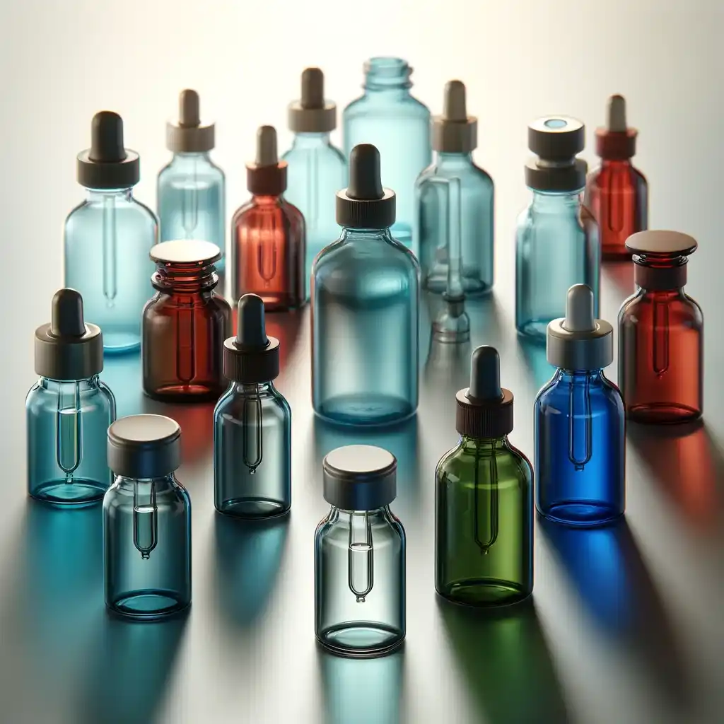 Botellas con gotero en marrón, azul, transparente, rojo, negro, violeta y verde